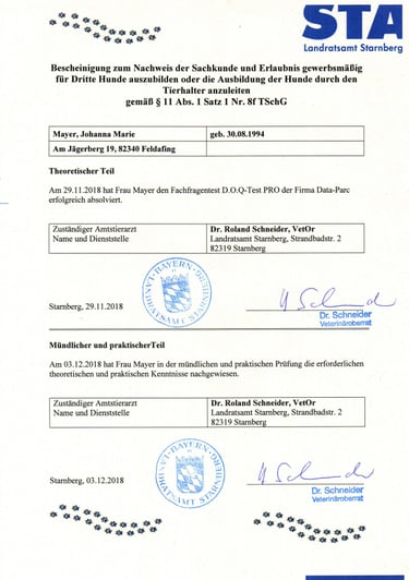 Hundetrainerscheinprüfung im Landratsamt -Veterinäramt- Starnberg (§11 Abs. 1 Satz 1 Nr. 8f TSchG)